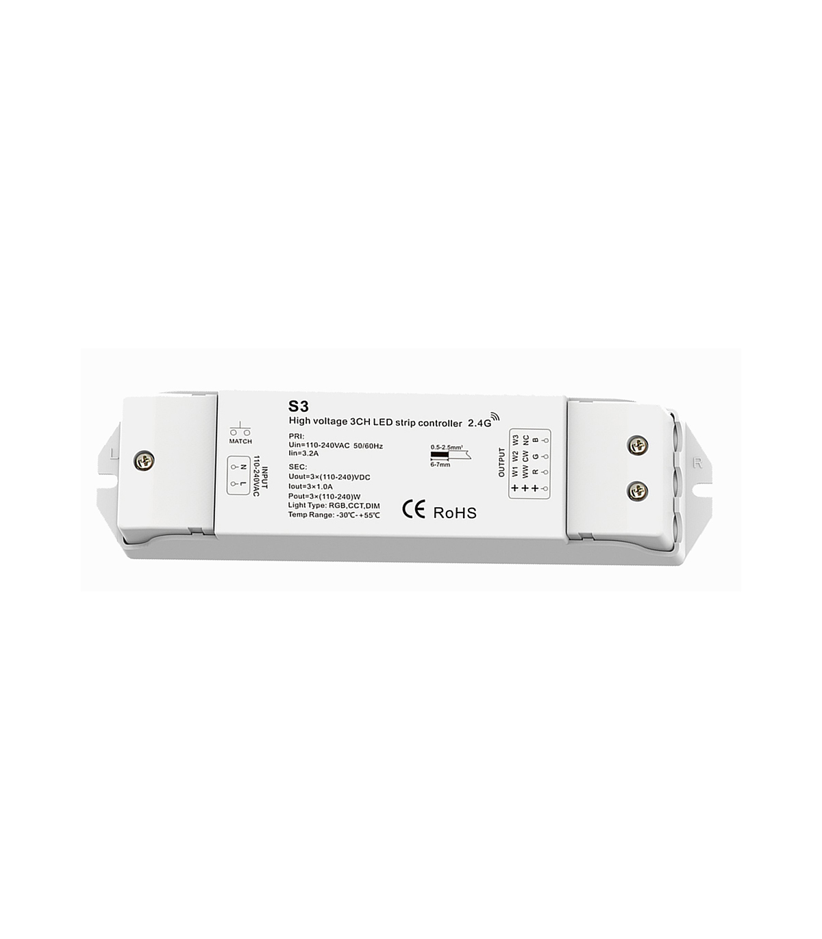 El Controlador LED Especial Tira 230V es un controlador inalámbrico para el control de tira de LED de alto voltaje RGB / CCT