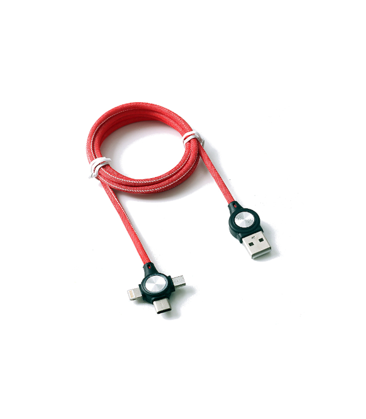 La Conexión USB Macho 3 en 1 es un cable de color rojo para realizar una conexión USB macho a micro USB, lightning y USB tipo C.