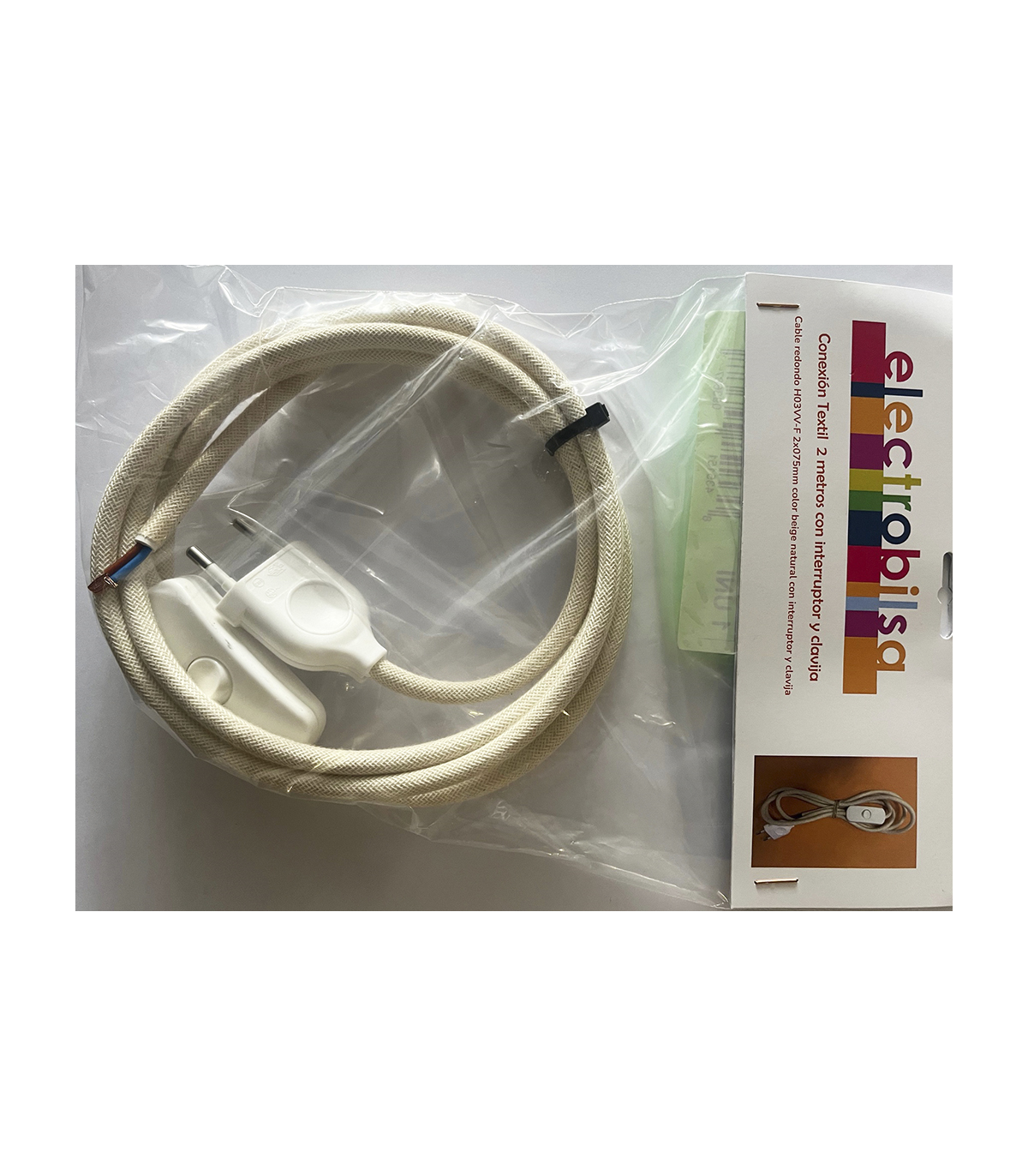 KIT CABLE TEXTIL ALGODON 2 mts 2 X 0.75 MM. + CLAVIJA + INTERRUPTOR BLANCOS