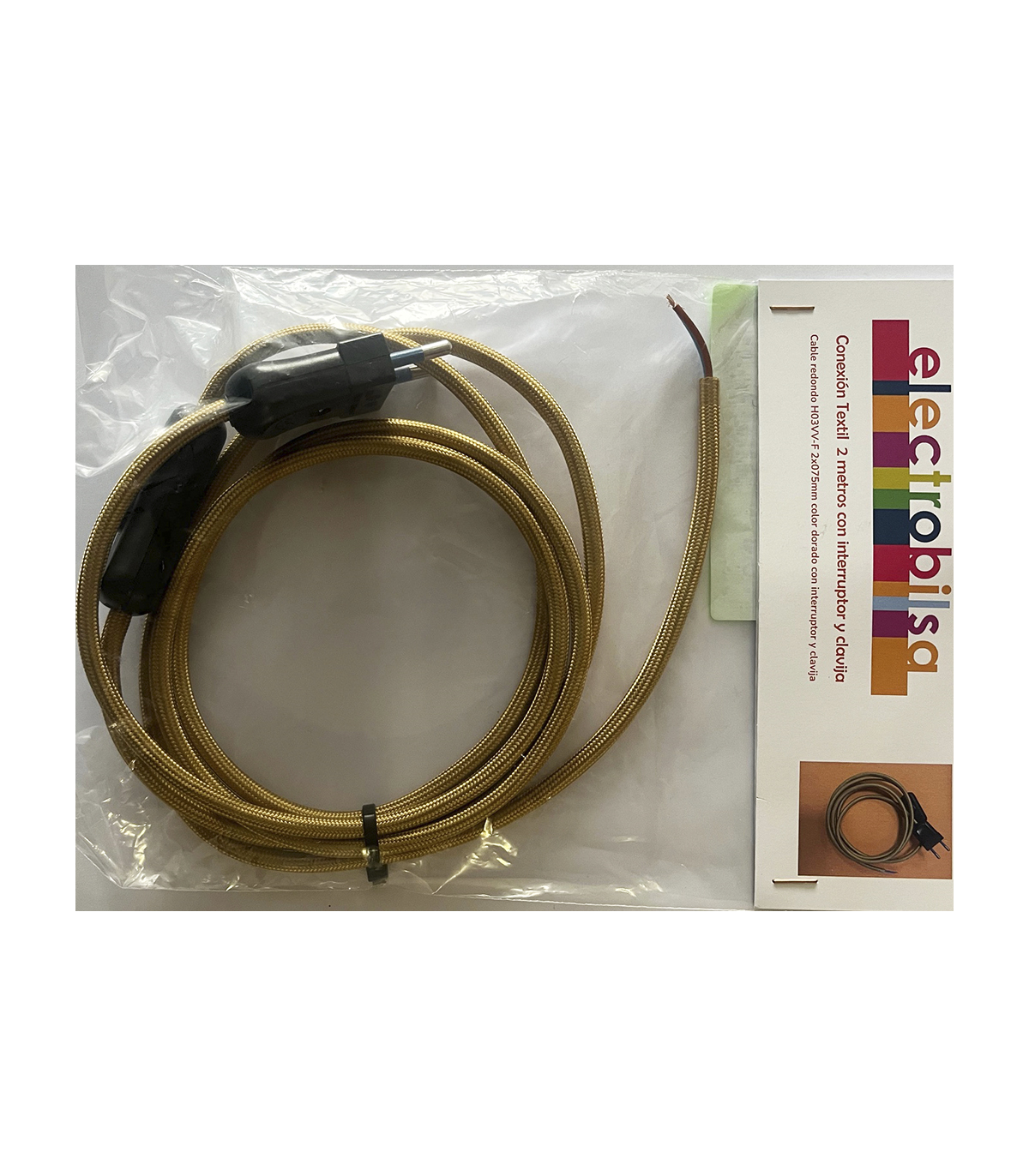 KIT CABLE TEXTIL DORADO 2 mts 2 X 0.75 MM. + CLAVIJA + INTERRUPTOR NEGROS