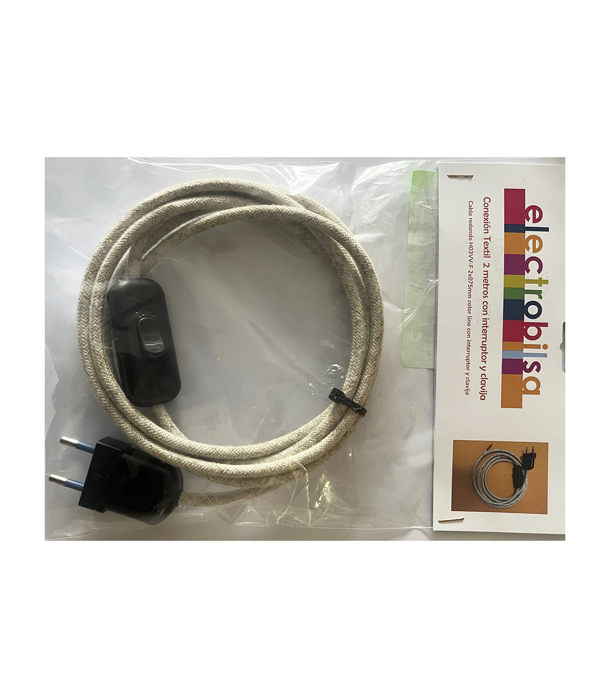 KIT CABLE TEXTIL LINO 2 mts 2 X 0.75 MM. + CLAVIJA + INTERRUPTOR NEGROS