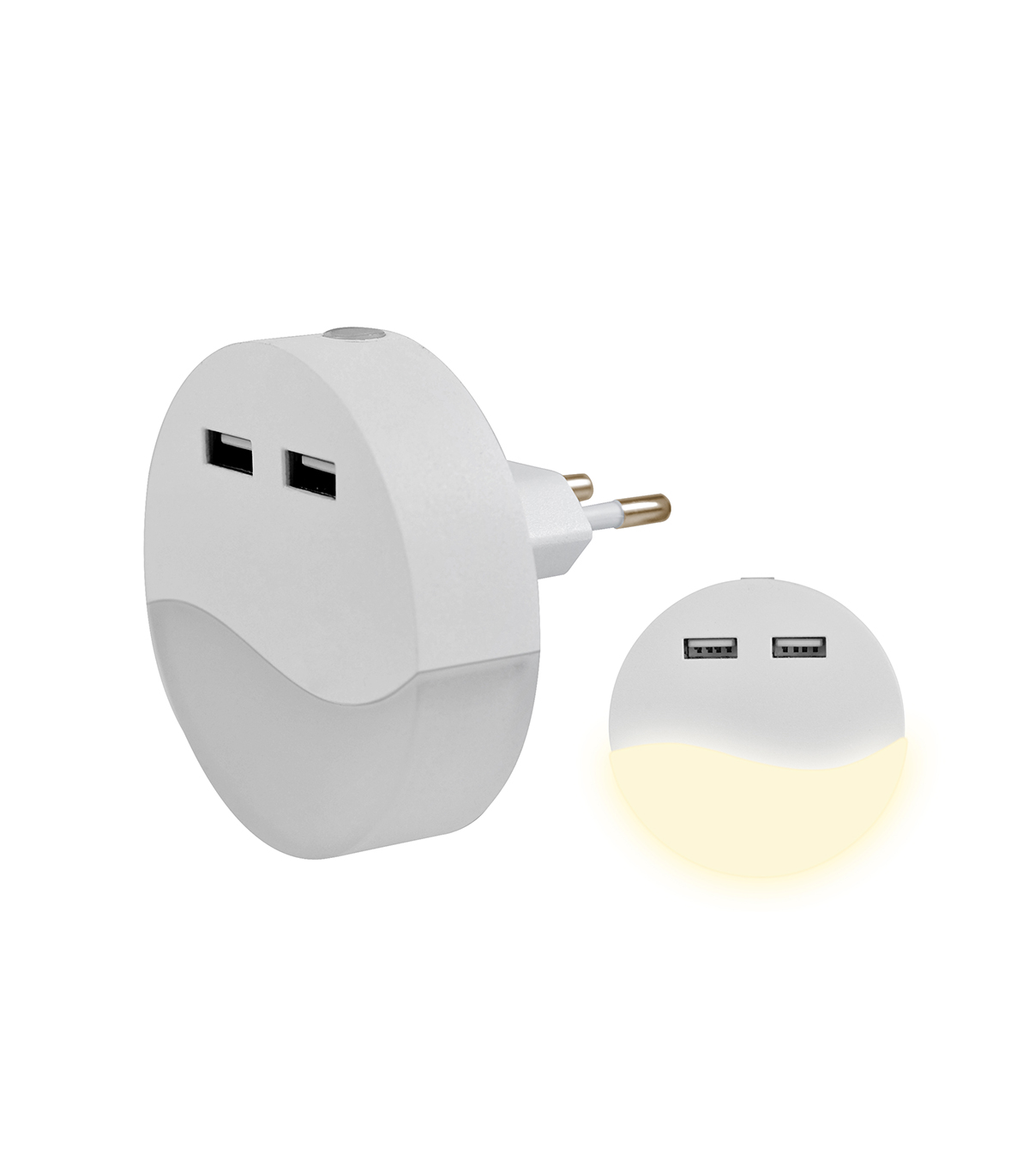 PILOTO LUZ NOCTURNA LED CON SENSOR CREPUSCULAR 2 USB 2A 0.5W 3000K REDONDO BLANCO