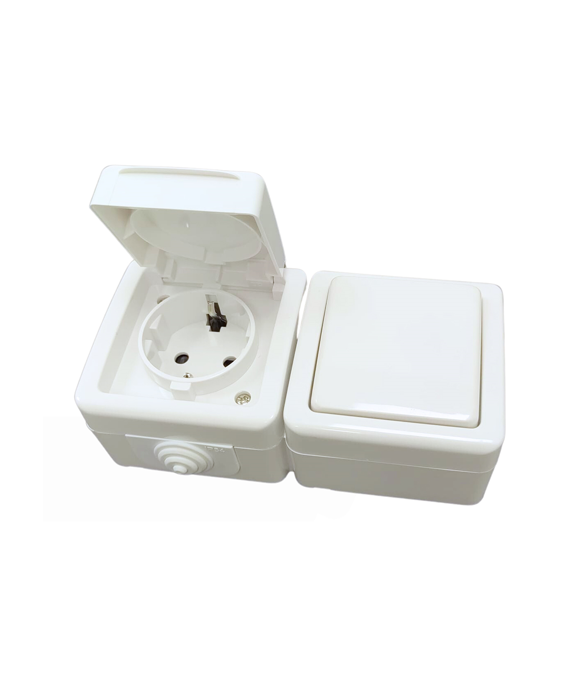 CONMUTADOR 10A 250V + BASE SCHUKO 16A 250V DE SUPERFICIE DE EXTERIOR IP54 BLANCO